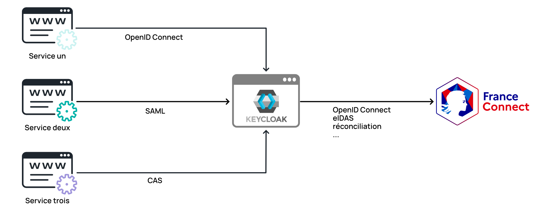 Du point de vue des services Keycloak est l’unique fournisseur d’identité. On retrouve donc la totalité des possibilités de Keycloak pour la délégation d’authentification : OpenID Connect, SAML et CAS (via une extension communautaire). Et charge à Keycloak de déléguer lui-même l’authentification à FranceConnect et de gérer toutes les spécificités liées à FranceConnect.