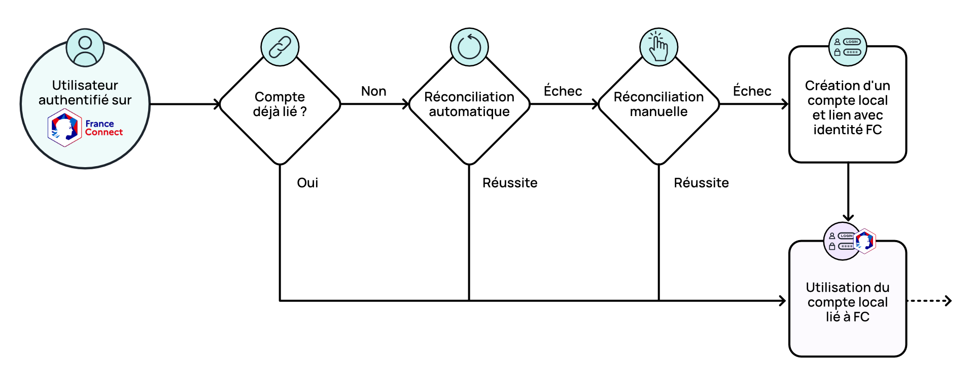 Pour les applications disposant de comptes locaux déjà existants et souhaitant proposer à ces utilisateurs de se connecter soit via leur compte local soit via FranceConnect, il existe un mécanisme de réconciliation (également appelé rapprochement) des comptes. Ce mécanisme a pour but d’établir un lien entre un utilisateur authentifié via FranceConnect et un compte existant. Habituellement, cette réconciliation se fait sur l’adresse email ou via une demande de ré-authentification locale de l’utilisateur, permettant ainsi à l’application d’établir ce lien.
